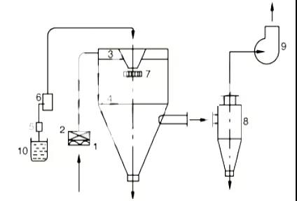 1空氣過濾器; 2個(gè)加熱器; 3個(gè)熱風(fēng)分配器; 4個(gè)干燥室; 5個(gè)過濾器; 6個(gè)泵; 7個(gè)噴頭; 8旋風(fēng)分離器; 9風(fēng)扇; 10料罐。