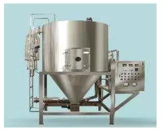 將物料液體通過塔體頂部的高速離心霧化器噴入非常細(xì)的霧狀液珠中,然后可以干燥成成品在很短的時(shí)間內(nèi)與熱空氣平行接觸。