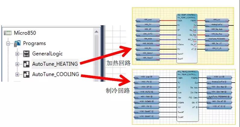 本案例的程序開發(fā)針對(duì)這兩個(gè)溫度控制過程,并采用羅克韋爾公司開發(fā)的溫度控制PID算法功能塊,具有易懂,操作簡(jiǎn)單,運(yùn)行可靠,具有自調(diào)整功能。